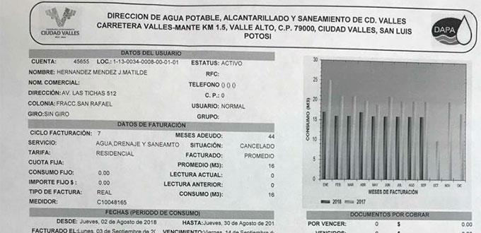Ciudad Valles.- Casi cuatro años lleva Matilde Hernández Méndez sin pagar el agua del domicilio en la calle Las Tichas 512, del fraccionamiento San Rafael, cuyo recibo aparece a su nombre y son 44 meses los que debe y el recibo sin embargo aparece con cero adeudos.