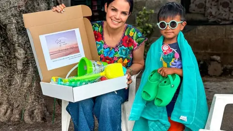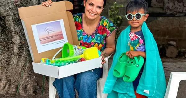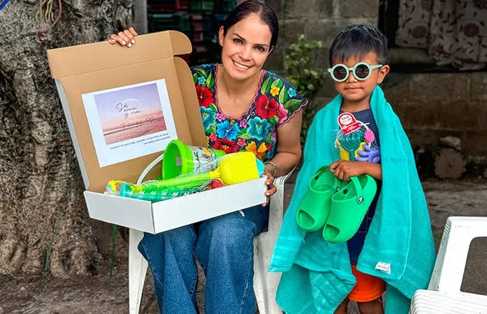 Karina saludó a Ángel y le regaló un kit con el que podrá disfrutar de su viaje a la playa.