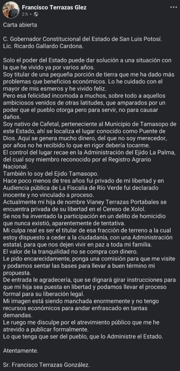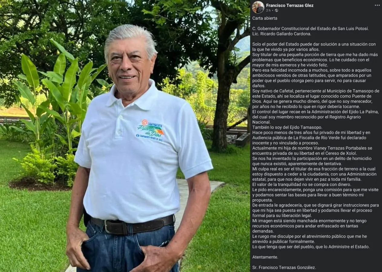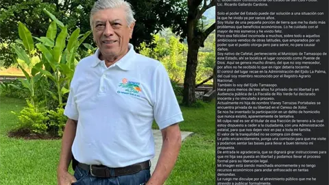 Un hombre originario de la comunidad El Cafetal, en el municipio de Tamasopo, hizo pública una carta dirigida al gobernador Ricardo Gallardo Cardona para solicitar la liberación de su hija, quien se encuentra recluida en el penal de El Xolol, acusada de homicidio.