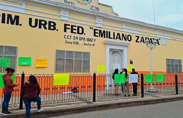 Mencionan que presuntamente la maestra colocó las pancartas en represalia porque fue cambiada al turno vespertino, exigen pida una disculpa pública por daño moral.