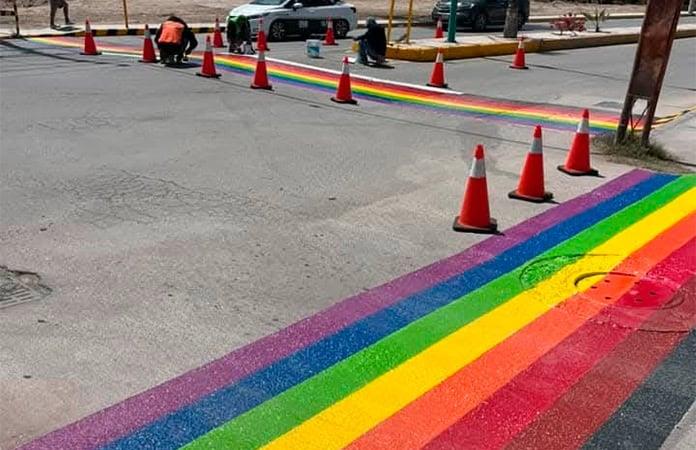 Matehuala.- Arreglan cruce peatonal de la Avenida Roble y Lerdo de Tejada, donde pintaron con los colores de la bandera del arcoíris como una manera de apoyar a las personas de la comunidad LGBTQ, así mismo se espera que pinten en más calles de la ciudad este tipo de cruces peatonales.