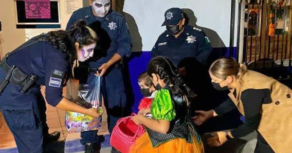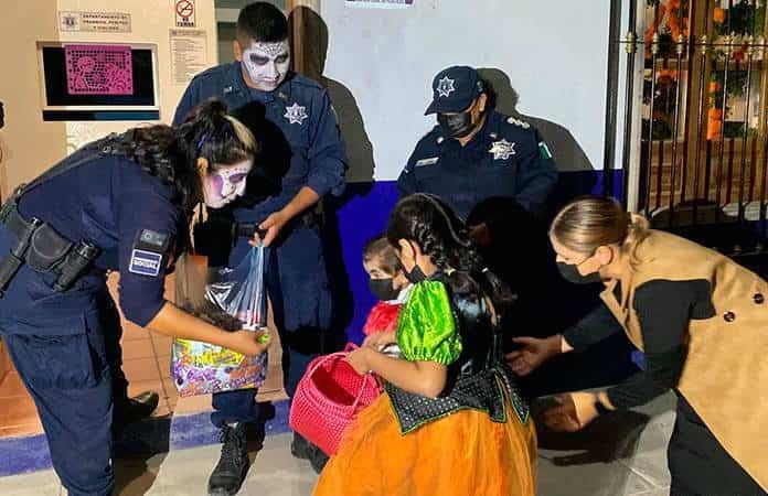 La directora de Seguridad Pública Municipal, Irma Salazar Juárez, refiere que para ello los agentes pintaron sus rostros de acuerdo a la tradición, y con anticipación adquirieron los dulces para poder repartirlos afuera de las oficinas de la corporación.