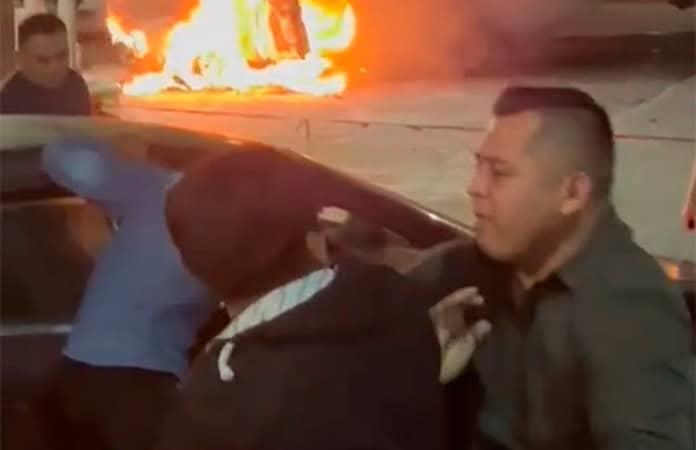 En el centro de la localidad una camioneta se quemaba por un cortocircuito y un grupo de jóvenes pasaba en un coche, a baja velocidad por el lugar.