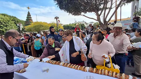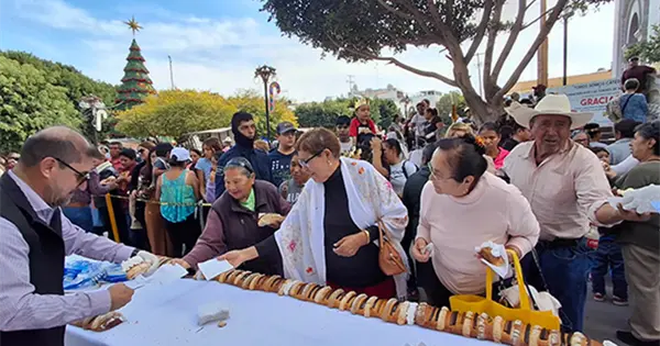 La mega rosca también contaba con el tradicional monito, por lo que a algunas personas les salió y de acuerdo a la tradición a los que les salga el monito tienen que hacer el atole y los tamales para la celebración del Día de la Candelaria.