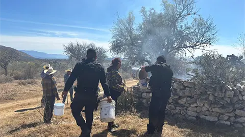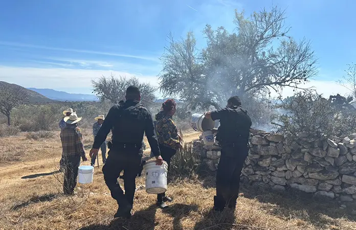 Matehuala.- Elementos de la policía municipal y corporaciones de auxilio así como habitantes de la comunidad La Joya, trabajaron en coordinación para controlar el fuego en una vivienda en la comunidad, pues se estaba incendiando el patio y en el interior del domicilio había dos adultos mayores.