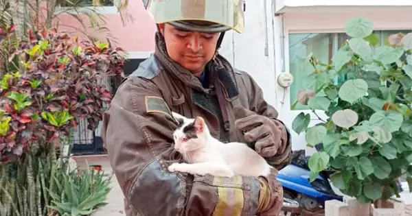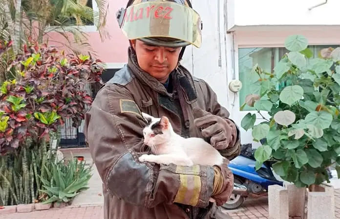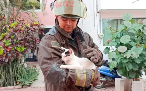 RIOVERDE.- Fue rescatado un gatito que quedó atorado en la estructura de una construcción por el Cuerpo de Bomberos, el cual por fortuna no resultó lesionado