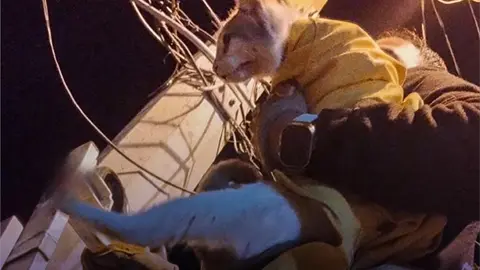 Rescatan bomberos gato atorado en un poste