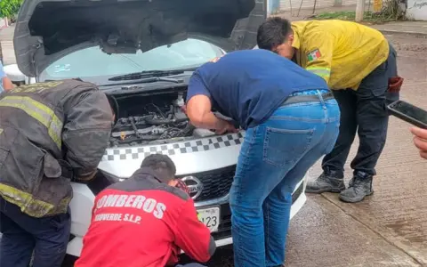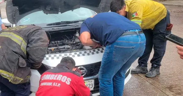 RIOVERDE.- Elementos del Cuerpo de Bomberos rescatan un gato que estaba atorado entre la parrilla y el radiador de un taxi, que pudo morir degollado al encender el motor del vehículo.