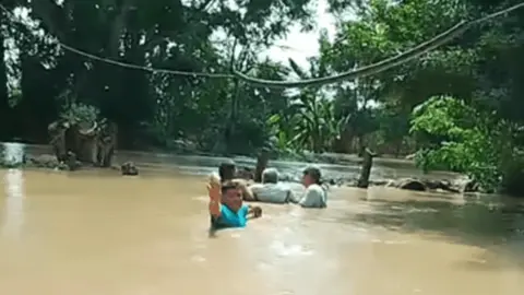 Los rescatistas se aventuraron a cruzar una de las partes severamente afectadas por las inundaciones, enfrentando la corriente para llegar hasta donde se encontraba el hombre.