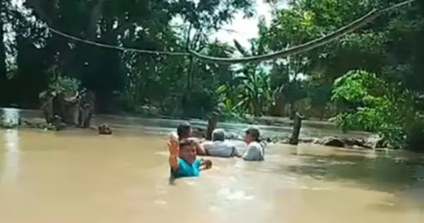 De acuerdo con los videos difundidos en redes, tres personas se organizaron rápidamente para localizar y auxiliar al abuelito, quien se encontraba aislado tras el desbordamiento.