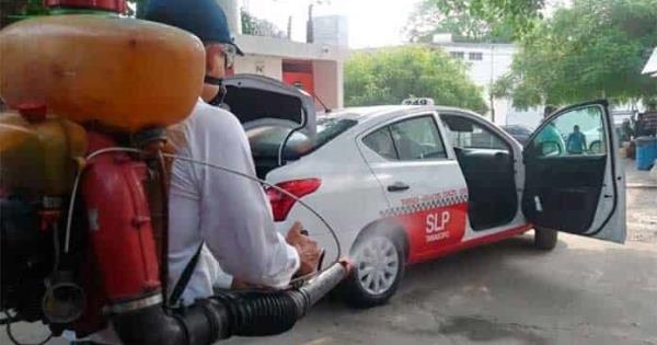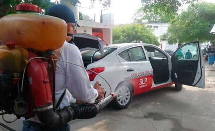 CIUDAD VALLES. Esta mañana el regidor Néstor Rivera Aguilera, de la comisión de Ecología, junto con el delegado del a SCT acudieron al sitio de Taxis Valles-La Hincada, con la finalidad de sanitizar las unidades con agua y cloro, con una especie de bomba que les donó la Jurisdicción Sanitaria V que es utilizada para las fumigaciones de prevención contra el dengue.