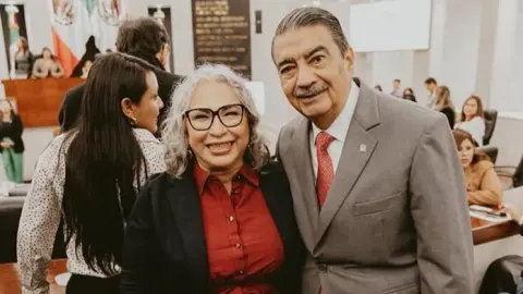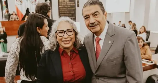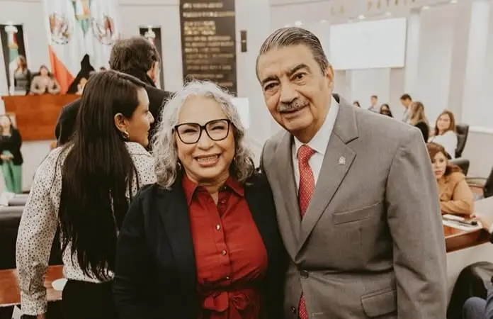 En la imagen, tanto el jefe universitario como la líder morenista, sonríen a la cámara y se abrazan con la tribuna legislativa a sus espaldas.