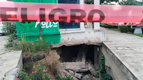 Lo que comenzó por ser un colapso del otrora área verde del banco, ahora es una caverna bajo el inmueble que ha dejado casi volando el piso de la ex institución bancaria.