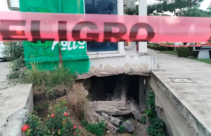 Desde que pasaron las lluvias de mediados de este 2025, la fuerza del antiguo arroyo entubado que baja desde la calle Bocanegra y desemboca en Niños Héroes, ha erosionado la tierra y piedras bajo el local que antes ocupó el banco Banorte, en el lugar ya descrito.