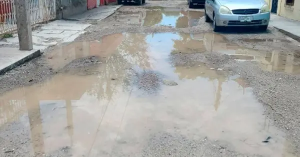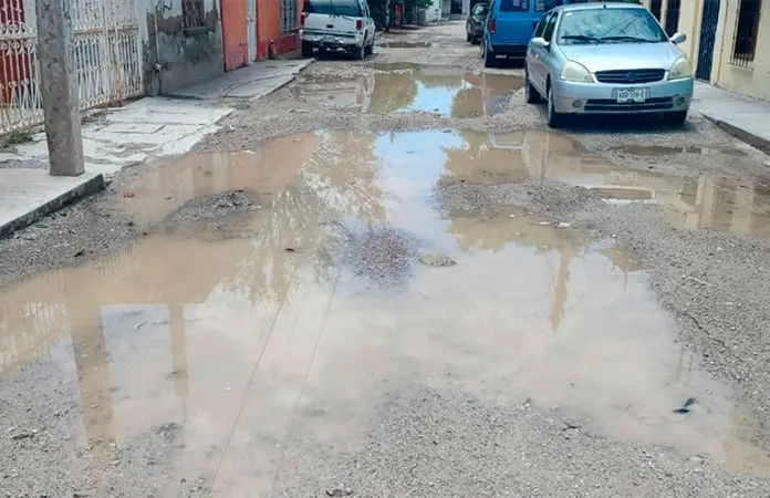 Vecinos demandan que se rehabilite esta calle, ya que el pavimento está completamente destrozado, lo que provoca que cada que llueva se formen enormes lagunas, que hacen imposible transitar a las personas como a motociclistas y automovilistas, y que además averían las unidades.