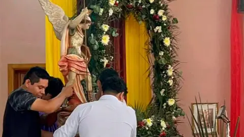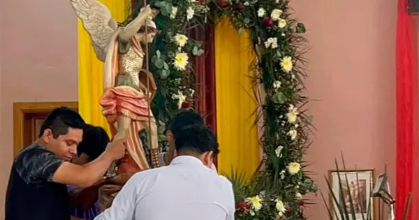 Después de haber concluido las fiestas patronales de San Miguel Arcángel la imagen quedó abajo para estar cerca de la gente unos días más, esperando que llegaran más feligreses a visitarlo y agradecerle las bendiciones que les ha dado.