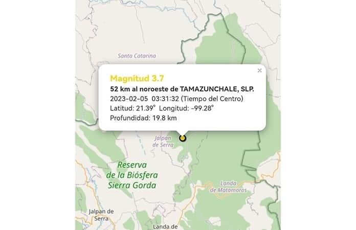 La ubicación del fenómeno geológico la coloca el SSN a 52 kilómetros al noroeste de Tamazunchale, que es la Sierra Gorda, cerca del municipio de Jalpan de Serra.