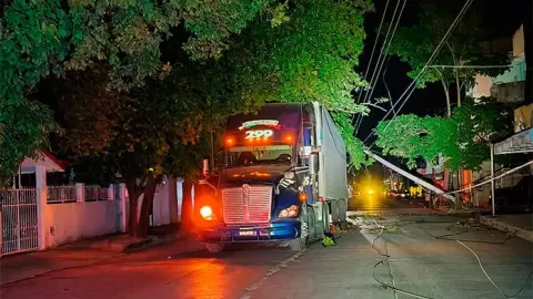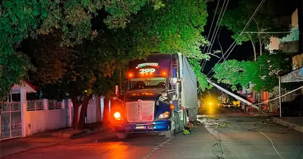 Pero al pasar por la intersección mencionada, la parte superior del tráiler se atoró con el tendido eléctrico. Pese a ello, el conductor continuó avanzando, lo que provocó la caída de un poste de concreto que sostenía cables de alta tensión.
