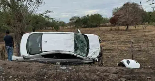 Se presume que el conductor, quien manejaba un vehículo blanco de la marca Nissan, circulaba a velocidad inmoderada y perdió repentinamente el control del volante, saliéndose de la carretera y terminando volcada la unidad.
