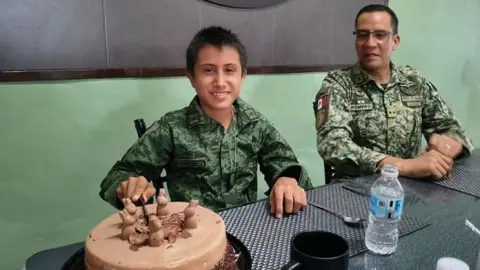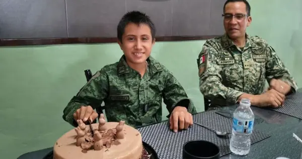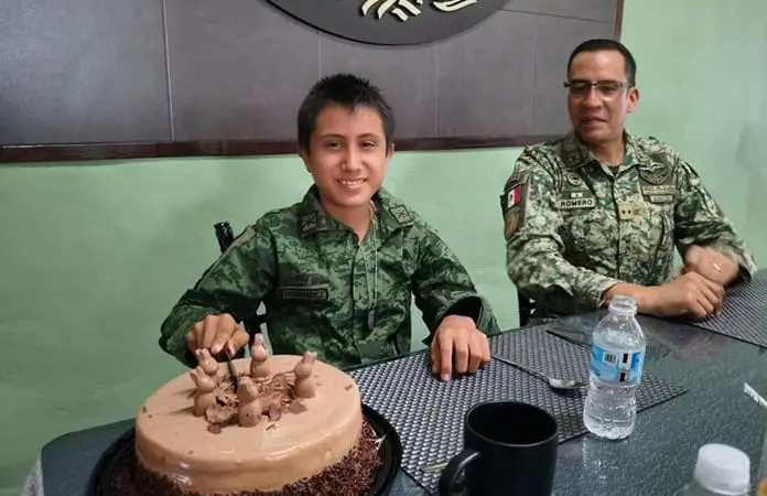 El niño Alexander Hernández Hernández, de 11 años de edad, quien pertenece a Villa El Cielo, dentro del Sistema DIF, hoy fue nombrado como parte de las Fuerzas Armadas, dentro del campo militar de Valles, luego de que el Comandante interino del 36 Batallón, Juan Carlos Romero Lucas le ofreciera este grado, ante la mirada de la licenciada del CREE, Graciela Curiel Soto.