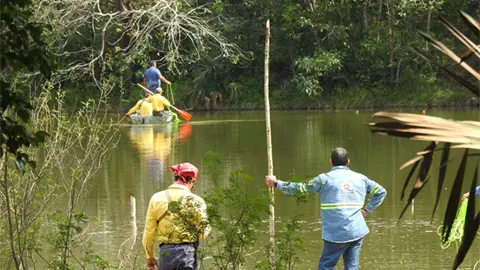CIUDAD VALLES.- Dos cocodrilos nadan en un estero del ejido La Pila, a un lado del plantel de Emsad y, desde hace días, Protección Civil Municipal se afana por capturarlos para reubicación.