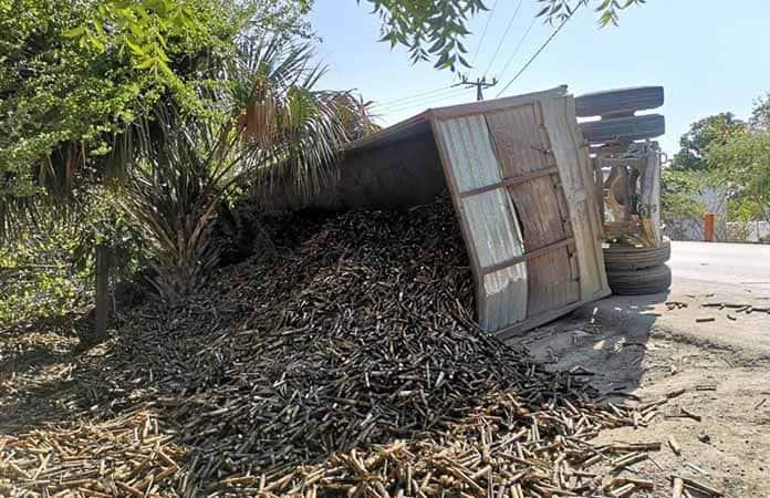 TAMUÍN. -Una supuesta falla mecánica habría ocasionado la volcadura de un camión cañero, en la carretera federal Valles-Tampico; el chofer resultó ileso.