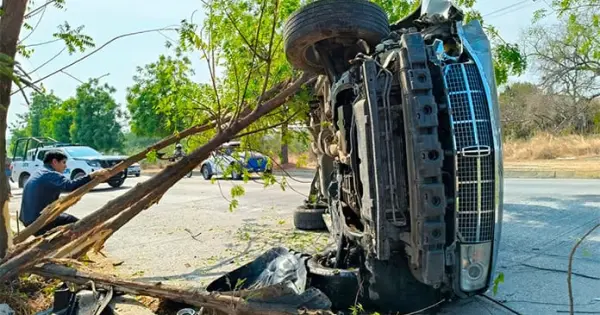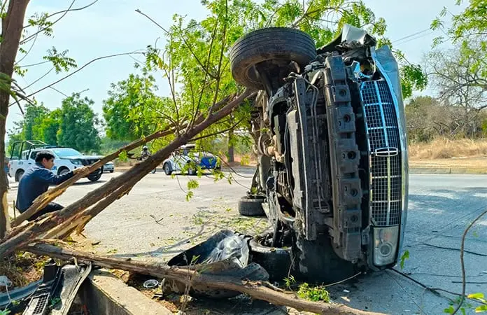 La unidad se salió del carril derecho, chocó contra una guarnición de concreto y un árbol, y finalmente volcó sobre su costado izquierdo.
