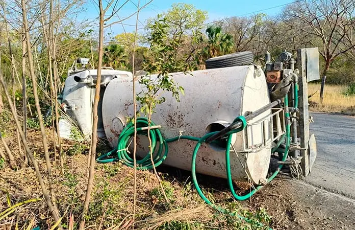 CIUDAD VALLES.- Una pipa utilizada para distribuir agua potable en comunidades indígenas de la zona tének volcó la tarde del sábado en la carretera La Pila - San Miguel.