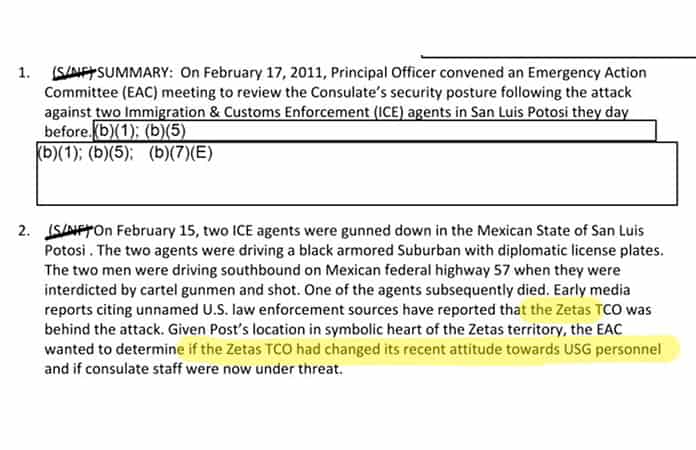 Los estadounidenses estaban al tanto de eso. Tras la agresión, la embajada y los consulados de EUA en México establecieron comités de acciones de emergencia. El reporte del DE sobre una sesión celebrada el 17 de febrero de ese año en el consulado de Nuevo Laredo (documento B-00002552339) citaba reportes de prensa que apuntaban a Los Zetas como responsables. Entre los asistentes se discutió un asunto inquietante: si los Zetas "habían cambiado su actitud" hacia el personal EUA en México y si ahora todos los diplomáticos estaban "bajo amenaza", lo que sugiere que el grupo criminal y el gobierno del vecino país tenían un acuerdo tácito que dotaba de "inmunidad" a sus agentes. Lo que se discutió después no se puede saber, pues el resto de las cuatro páginas aparece censurado.