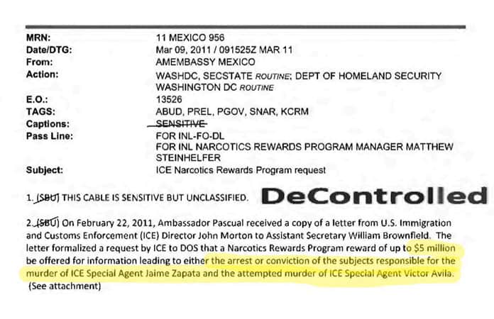 La subtrama de la captura tiene un colofón interesante. El 9 de marzo de 2011, un cable de un funcionario del DE a otro de una dependencia no identificada (documento B-00002428191) informaba que en febrero el ICE solicitó al Departamento de Estado la autorización de una recompensa de cinco millones de dólares por información que llevara a la captura de los responsables del ataque. Más adelante, el DE hizo pública la recompensa.