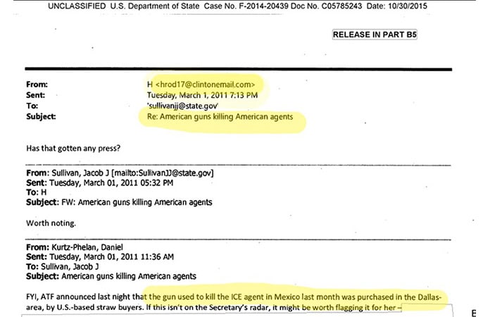 En un correo titulado "Armas americanas mataron a agentes americanos" (documento C05785243), emitido en marzo de 2011, un funcionario del DE enviaba al despacho de su jefa, Hillary Clinton, la nota de AP del descubrimiento señalando que si "la secretaria no tenía el dato en su radar "valdría la pena marcarlo para ella".