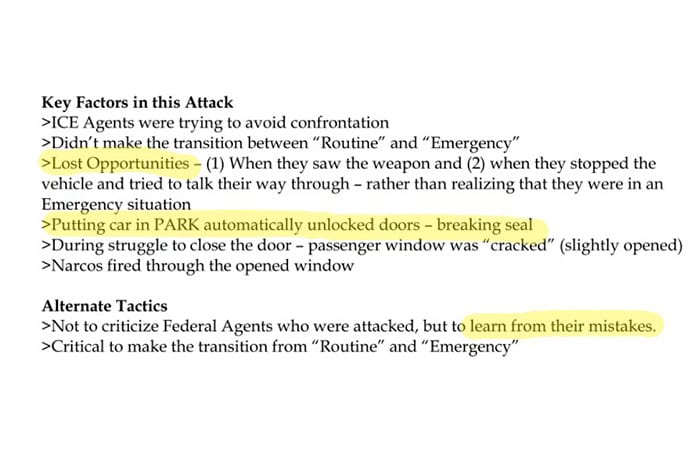 Señalaron que "sin criticar a los agentes federales que fueron atacados, hay que aprender de sus errores", pues debieron asumir que estaban bajo un posible ataque mortal desde que empezaron a ser forzados a detenerse y cuando vieron a civiles armados con rifles AK-47.