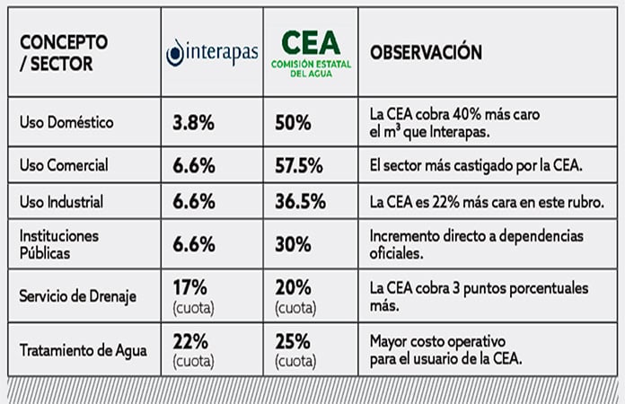 El contraste entre las tarifas de ambos organismos es brutal. La CEA cobra 40 por ciento más que el Interapas en los servicios doméstico y comercial.