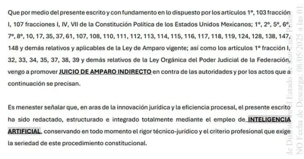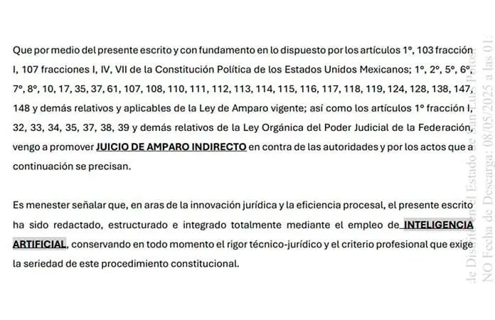 “Es menester señalar que”, dice en una parte, “en aras de la innovación jurídica y la eficiencia procesal, el presente escrito ha sido redactado, estructurado e integrado totalmente mediante el empleo de inteligencia artificial, conservando en todo momento el rigor técnico-jurídico y el criterio profesional que exige la seriedad de este procesamiento constitucional”.