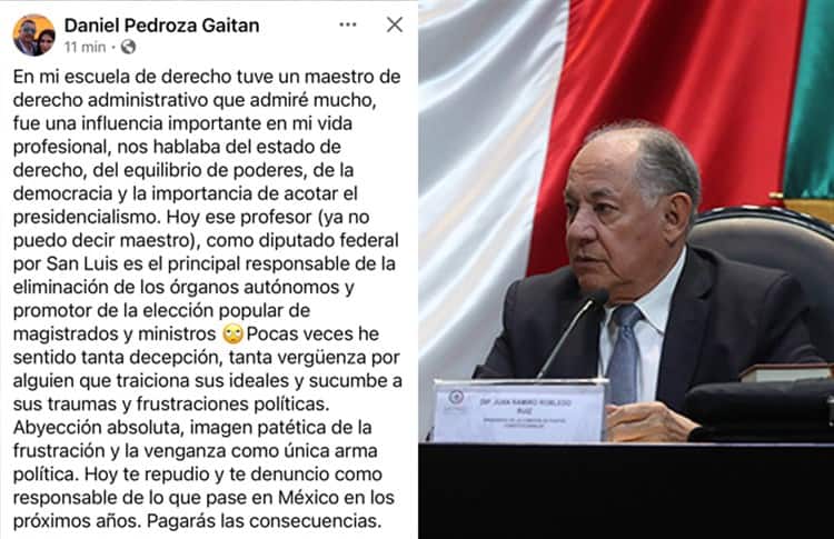 EL PROFE EJEMPLAR. Las demostraciones de repudio a esas reformas marchan también. Ya lo declararon “non grato” de parte de Fuerza Rosa. Pero fue un post con la remisión de un exalumno, Daniel Pedroza Gaitán, el que más circuló al cierre de la semana. El abogado Pedroza recuerda al hoy legislador federal como un maestro de Derecho que hablaba a sus alumnos del equilibrio de poderes, de la democracia y de acotar al presidencialismo. A ese profesor, lo señala como el principal responsable de la desaparición de organismos autónomos y promotor de la elección popular de jueces
