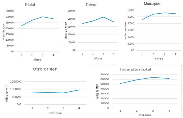 El gasto en los documentos del informe está dividido en 4 fuentes: estatal, federal, municipal y otro origen.