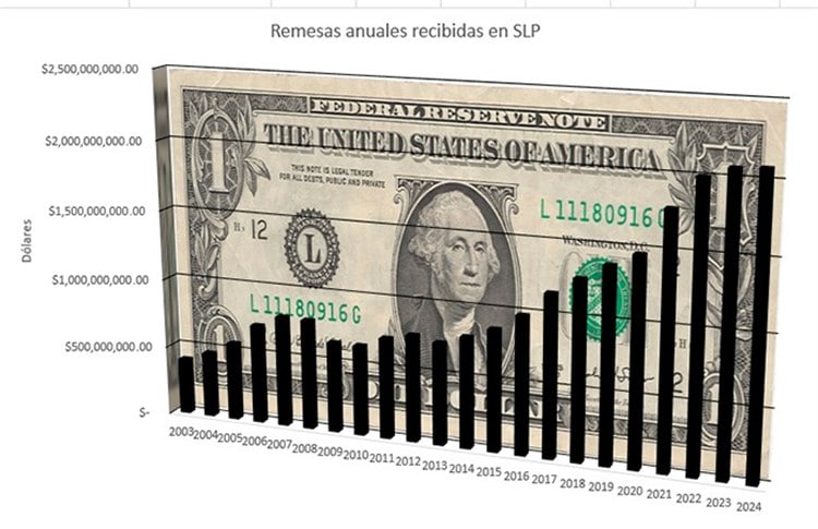 Convirtiendo el monto de las remesas a la cotización promedio del dólar, en 2024, San Luis recibió 38 mil 166 millones de pesos.