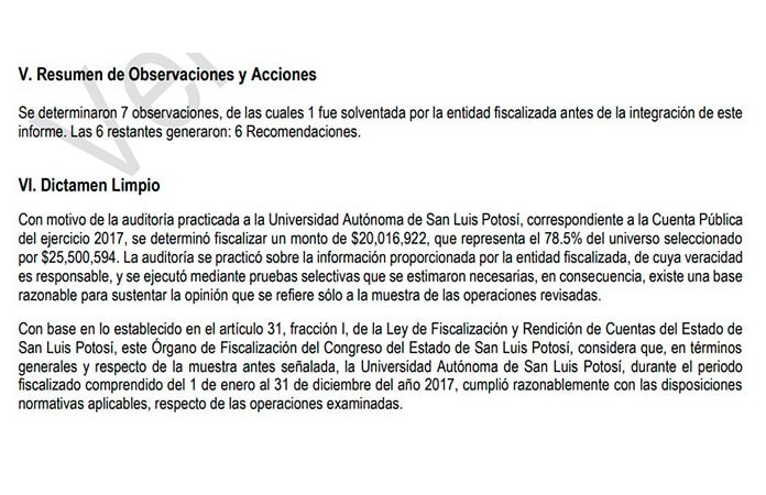 Con ella, La UASLP vivió una época dorada en materia de fiscalización: cuatro años en los que la universidad no registró una sola observación, con dictámenes limpios. En ese lapso, los reportes finales no hacen una sola referencia a los recursos propios universitarios y, en cambio, acota a los recursos estatales y federales el alcance de la revisión.