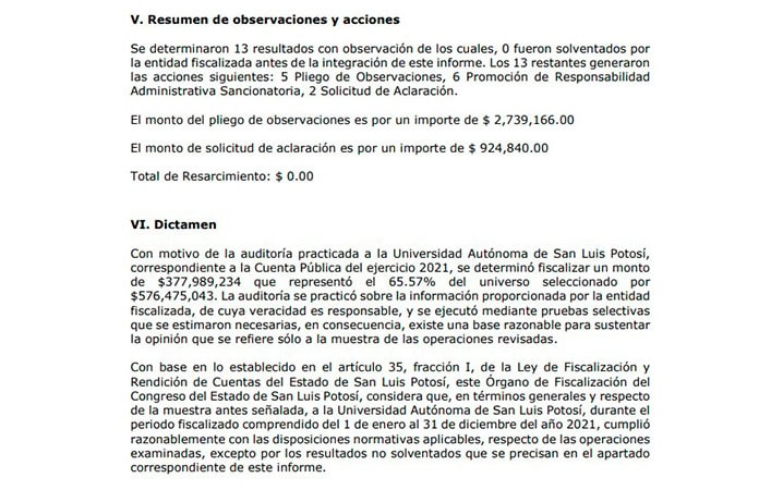 El cambio es radical. Desde la primera línea del informe final de auditoría, el AEFPO-173-UASLP-2021, la ASF establece que fiscaliza los ingresos propios de la UASLP, tasados en 619.8 millones de pesos. Y se acabaron las auditorías limpias, pues la ASE reportó observaciones financieras por 3.6 millones de pesos. La mayor parte de ellas, relacionadas con el ejercicio del ingreso propio.