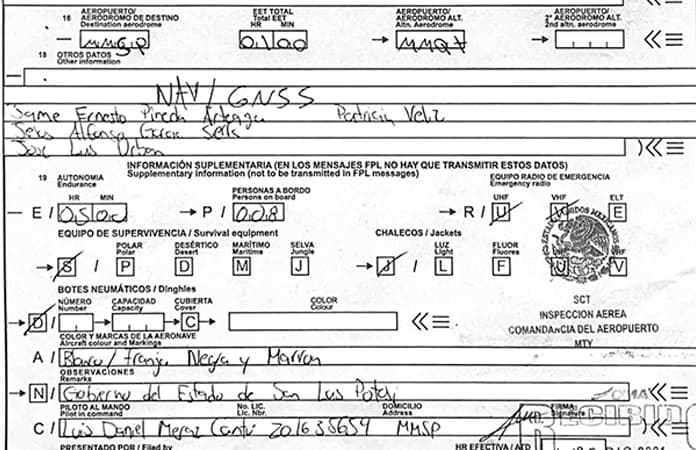 VIAJE EXTRAÑO. El que al menos documenta que hicieron en el avión oficial del Estado (XC-SLP) el ex secretario de Seguridad, Jaime Ernesto Pineda Arteaga; la secretaria de Turismo, Patricia Véliz; el director de la Policía Estatal, José Luis Urban, y otra persona de la que sólo es legible en el registro su nombre de pila, "Jesús Alfonso", no así sus apellidos. El reporte de plan de vuelo (entregado a la autoridad aeronáutica federal) está llenado a mano, con fecha 8 de diciembre de 2021; dos meses y tres días después, la Fiscalía del Estado anunciaba la detención de Pineda Arteaga bajo cargos de abuso de funciones, atribuciones y facultades.