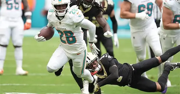 MIAMI GARDENS.- De’Von Achane corrió para 134 yardas y un touchdown, y los Dolphins de Miami ganaron su tercer partido al hilo, imponiéndose el domingo 21-17 ante los Saints de Nueva Orleans.
