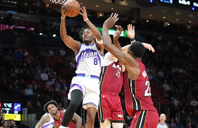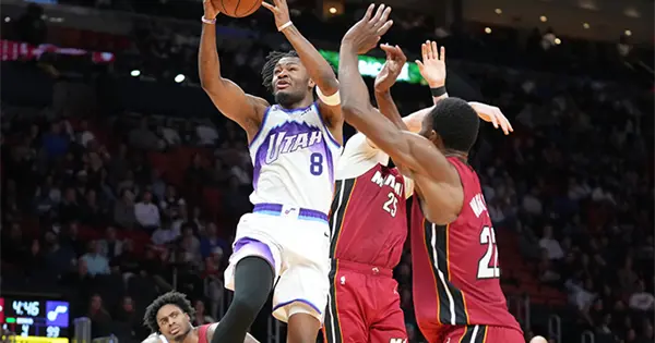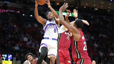 MIAMI.- Brice Sensabaugh encestó un triple decisivo con 47 segundos restantes para darle la victoria el lunes 115-111 al Jazz de Utah ante el Heat de Miami.