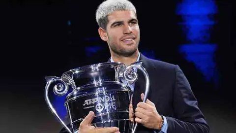 El español de 22 años recibió el trofeo en el Inalpi Arena de Turín, poco antes del partido de Sinner contra Ben Shelton.