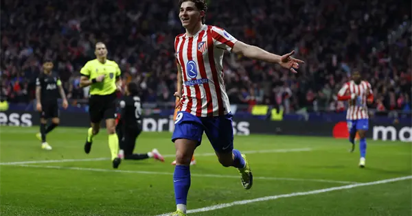 Una puesta escena esperpéntica del Tottenham y su portero Antonin Kinsky, exageración absoluta del error no forzado, impropia de la Liga de Campeones, desencadenó la victoria más fulminante (5-2) que jamás ha logrado el Atlético de Madrid en las eliminatorias del gran escenario europeo, rumbo firme, aparentemente invariable, a los cuartos de final con tres goles de renta y la vuelta pendiente en Londres en una semana.