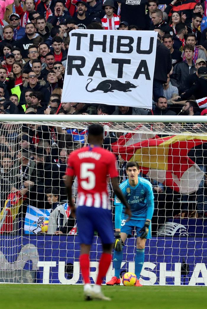 La afición del Atlético le tenía preparado un auténtico purgatorio de silbidos al portero belga, otrora ídolo rojiblanco durante tres temporadas en las que estuvo cedido por el Chelsea inglés, en las que ganó una Copa del Rey y una Liga. Su placa en el 'Paseo de Leyendas' apareció ensuciada y con ratas de peluche.