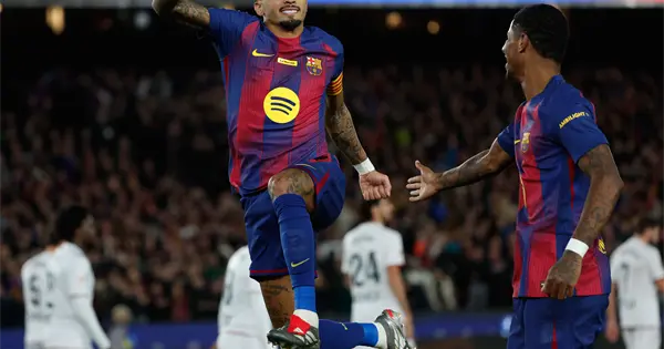 El primer gol de Raphinha llegó después de que el Barcelona recuperara el balón y Pedri González liderara un contraataque antes de pasarle el balón para que anotara desde lejos. Su segundo fue más fácil: un remate tras un desvío del defensor de Osasuna, Alejandro Catena, a un centro de Jules Koundé al segundo palo donde Raphinha estaba sin marca.