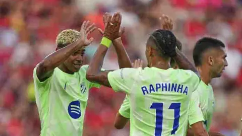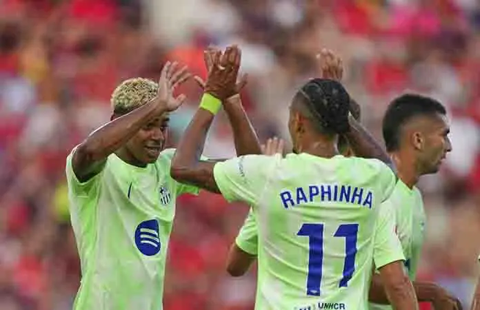 Raphinha y Lamine Yamal, quienes lideraron el prolífico ataque del Barcelona la temporada pasada, necesitaron solo siete minutos para impresionar nuevamente. Yamal encontró a Raphinha con un centro curvado cerca del segundo palo y que el delantero brasileño cabeceó.