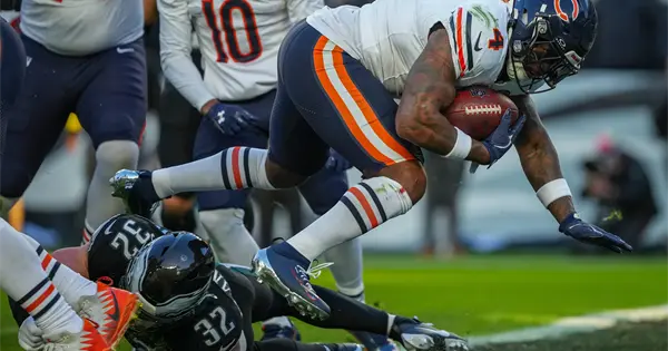 FILADELFIA (AP) — Kyle Monangai corrió para 130 yardas y un touchdown, D´Andre Swift añadió 125 yardas por la misma vía y otra anotación, y los Bears de Chicago terminaron con 281 yardas por tierra para ganar su quinto partido consecutivo al superar 24-15 a los tambaleantes Eagles de Filadelfia el viernes por la noche.