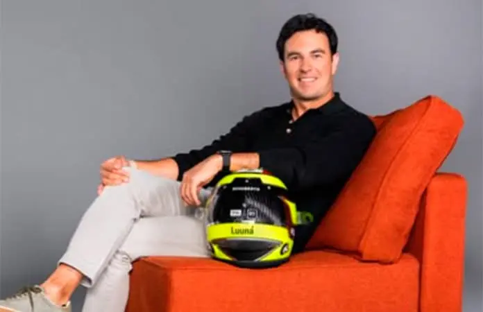 En la parte de arriba, se observa la bandera de México y alrededor del mismo caso se pueden apreciar los patrocinadores de "Checo" como KitKat, Claro, Mercado Libre, Tommy Hilfiger y otros que acompañan al mexicano en este camino.