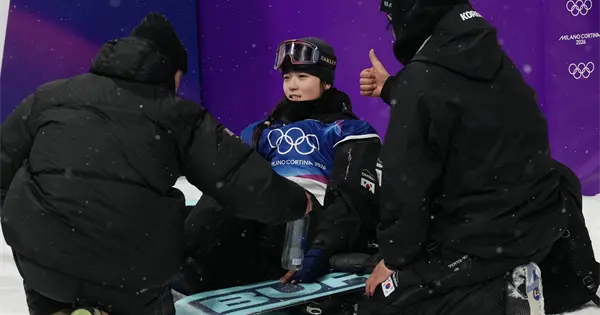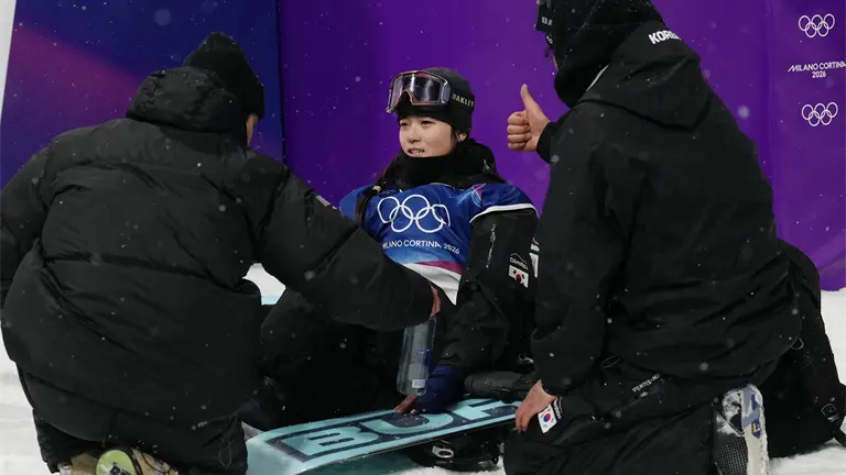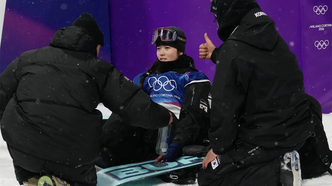 Choi sufrió una dura caída en su primera bajada antes de sorprender a Kim y al resto del público reunido en una noche nevada en los Alpes italianos. Choi se estrelló contra la pendiente del halfpipe y se deslizó hasta la mitad del recorrido, donde permaneció varios minutos. Tras ser atendida por el personal médico, salió del recorrido sin ayuda.